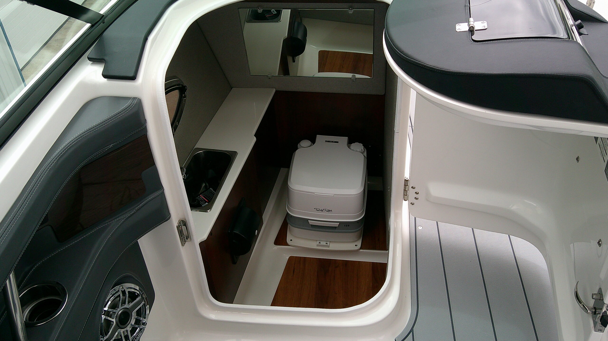 - Full Fiberglass Head Compartment with Porta Pottie and Vanity Sink