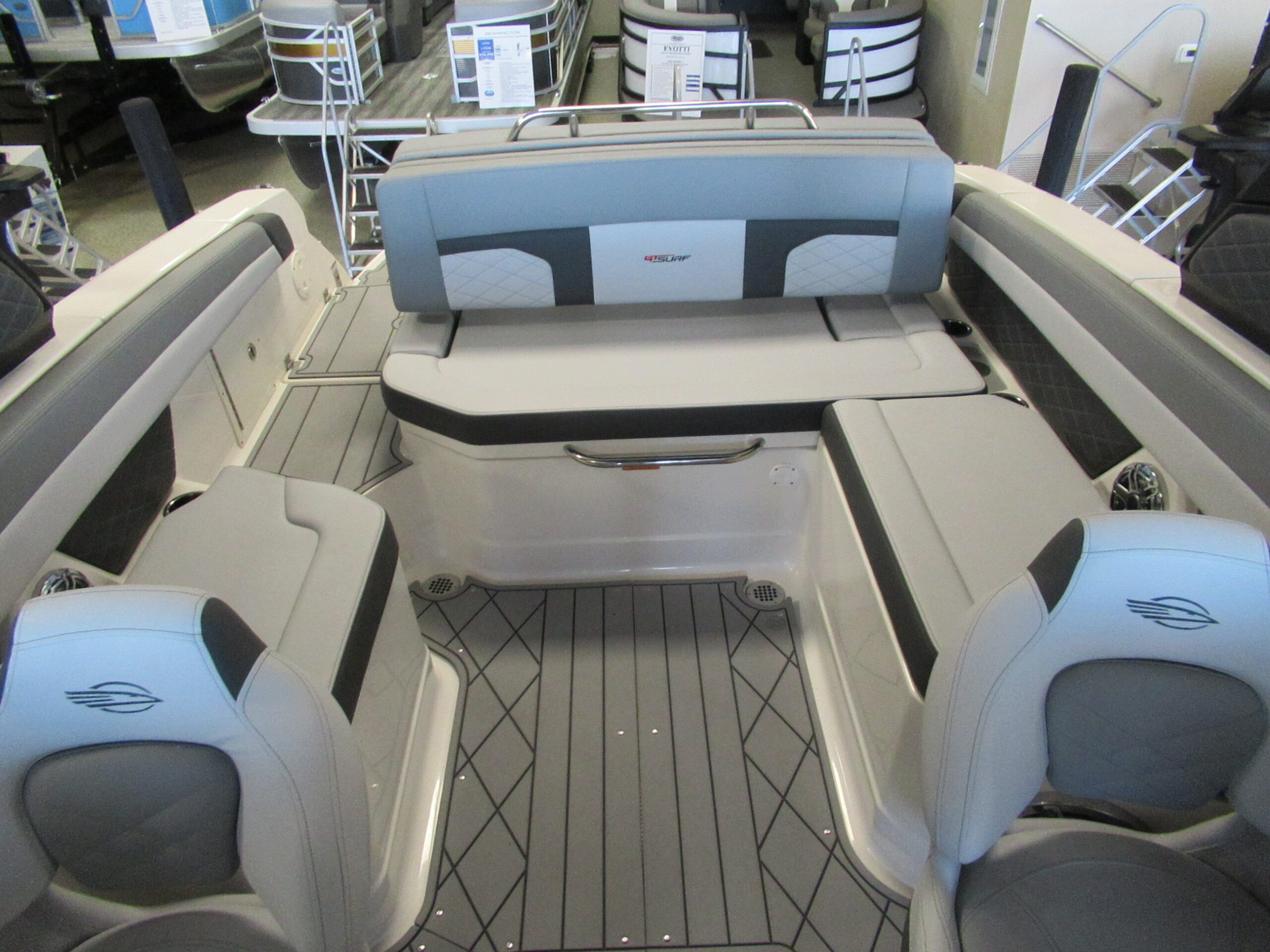 AFT BENCH SEATING WITH REVERSIBLE BACKREST SYSTEM (CONVERTS FROM DOUBLE BENCH SEATING TO SUN LOUNGE)