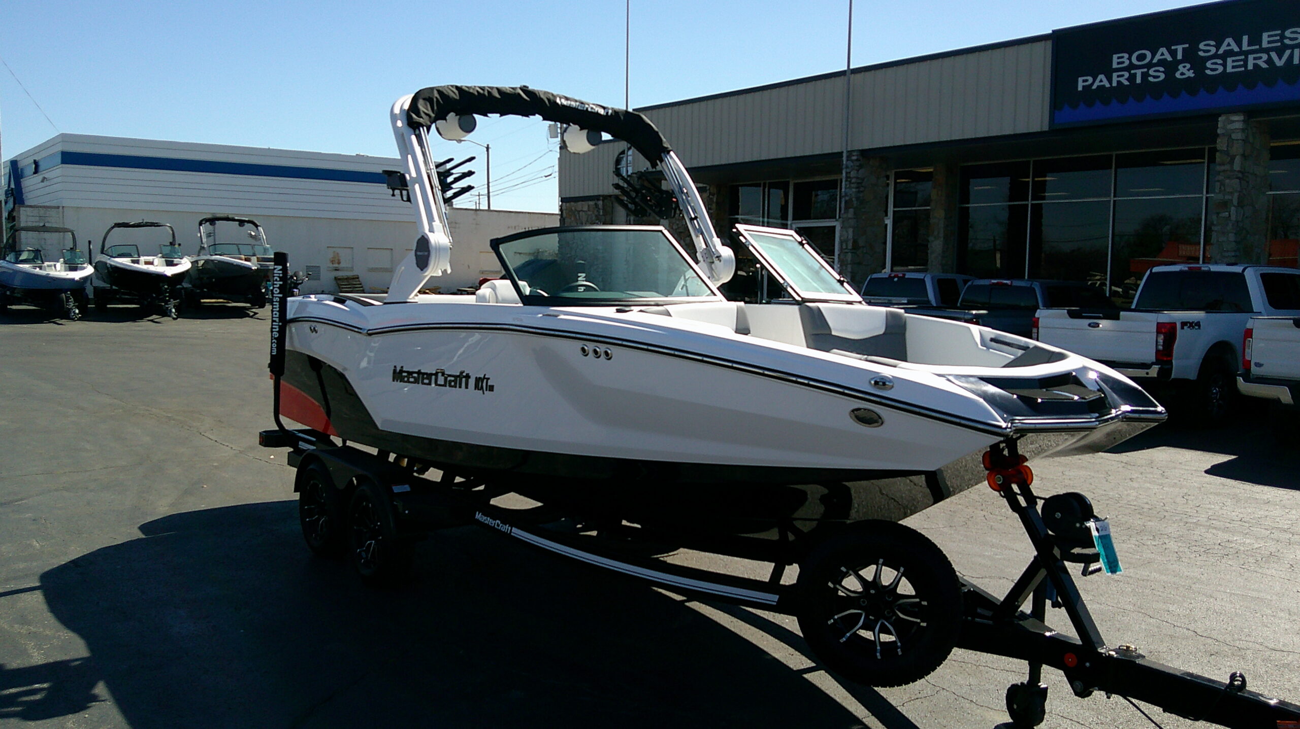 NEW 2026 MASTERCRAFT NXT 22. ILMOR 5.3L 380HP ENGINE. MASTERCRAFT SURF-STAR w/ SURF/WAKE/SKI PRESETS. 3,000 LBS OF BALLAST. 7inch TOUCHSCREEN WITH INTEGRATED MERIDIAN ADV AUDIO & TOWER SPEAKERS. TILT STEERING WHEEL, CONTOURED CAPTAIN’S SEAT WITH BOLSTER. DIGITAL SWITCHING. Z6 hydraulic assist WHITE TOWER w/ CLAMPING BOARD RACKS. SEATING FOR UP TO 14 OF YOUR FRIENDS AND FAMILY. DEEP WALK THRU BOW SEATING. BLACK TRANSOM SEADECK ON SWIM STEP & WALK-THRU. BLACK SEADECK FOR THE COCKPIT AREA. TRANSOM STEREO REMOTE WITH BLUETOOTH. WHITE, ORANGE, WITH BLACK EXTERIOR PAINT. COOL-FEEL GREY & WHITE UPHOLSTERY WITH ORANGE ACCENTS. BIMINI w/ SURF SELEVES. MASSIVE SWIM PLATFORM. MOORING COVER. CUSTOM TANDEM AXLE TRAILER WITH BREAK AWAY TONGUE INCLUDED.